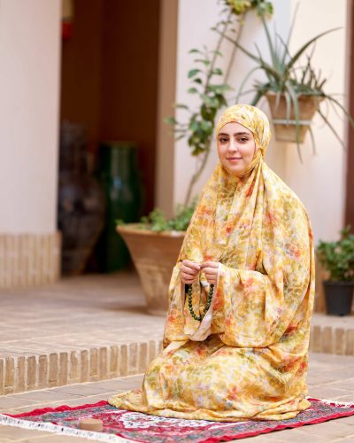 چادر نماز رنگی طرحدار پارچه کُدَری زمینه زرد کد CH 012