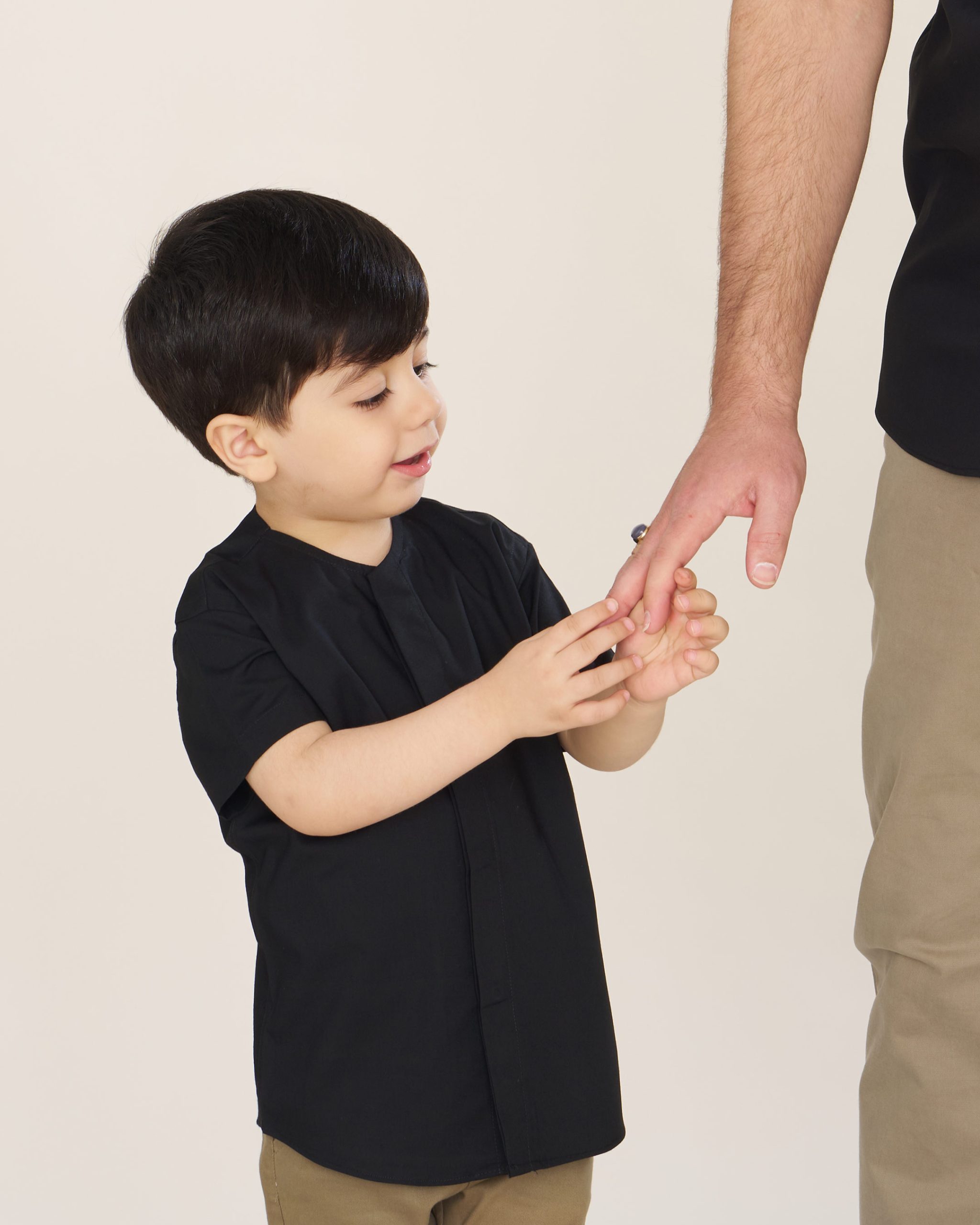 پیراهن هادی بدون یقه دکمه مخفی مشکی آستین کوتاه پسرانه کد PB12085