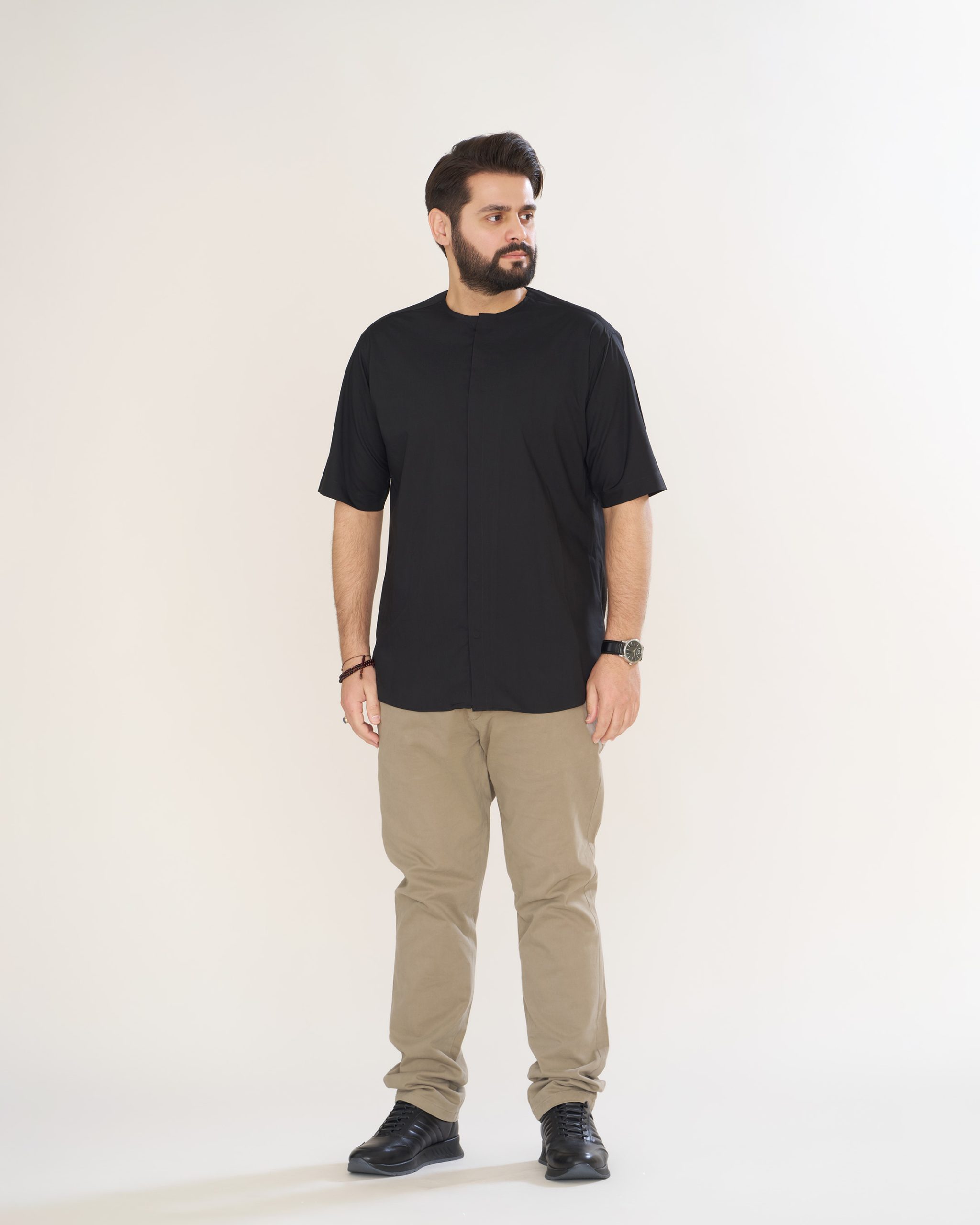 پیراهن هادی بدون یقه دکمه مخفی مشکی آستین کوتاه مردانه کد PM21039