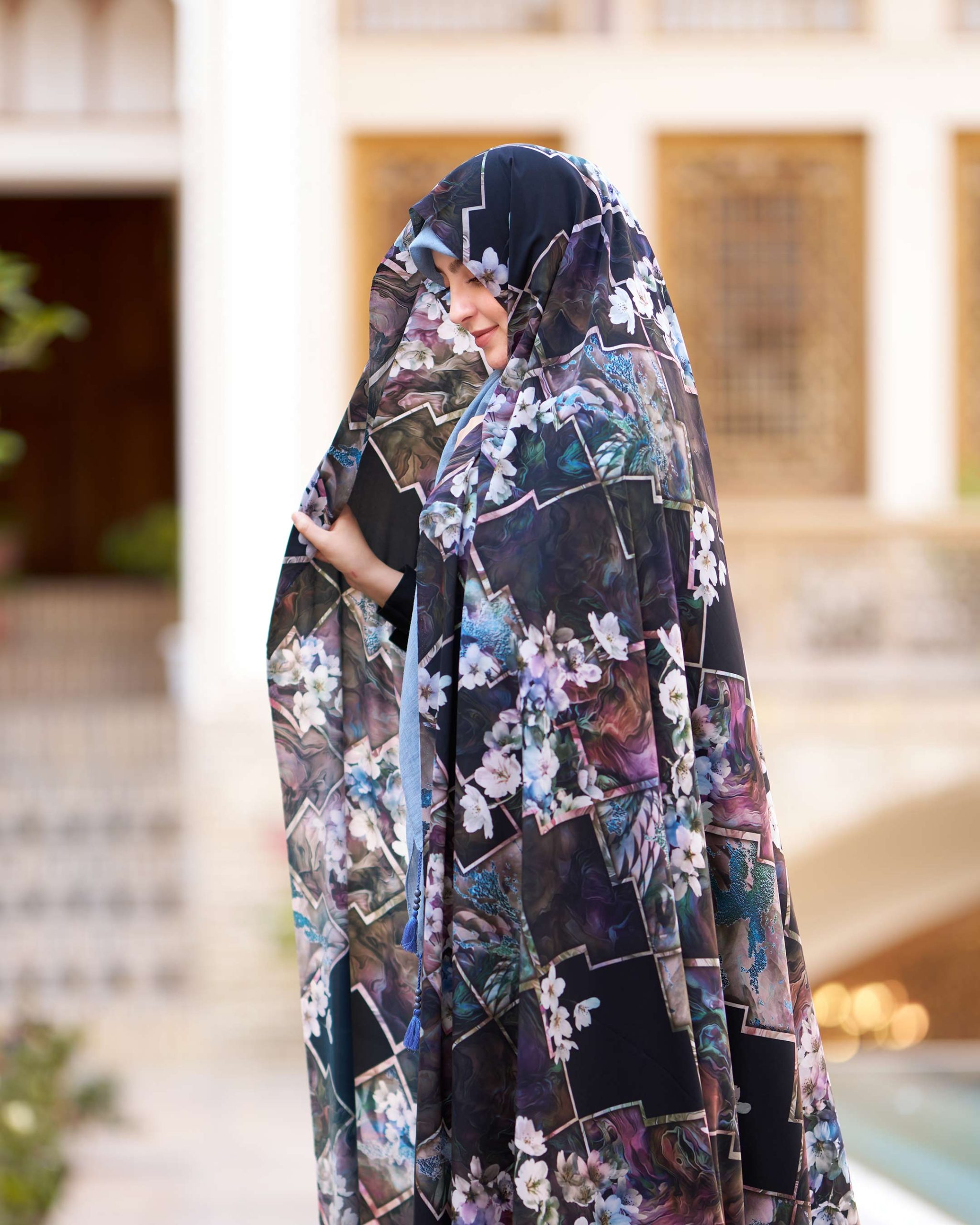 این چادر زیبا سه بعدی پارچه ای مات و درخشان دارد. این ویژگی متضاد گل های درخشان را از زمینه مات بیرون می کشد و باعث می شود گل ها سه بعدی به نظر آیند. گل های درخشان و زمینه مات درخشندگی و جلوه خاصی به چادر می دهد. در زمینه چادر رنگ ها به گونه ای مات شده اند که در دسته رنگ های خنثی قرار می گیرند و این زمینه با رنگ خنثی آن را بسیار شیک کرده و هرگز خسته کننده نمی شود. در رنگ گل ها از رنگ متضاد زمینه استفاده شده که همه، رنگ های شاد هستند.
