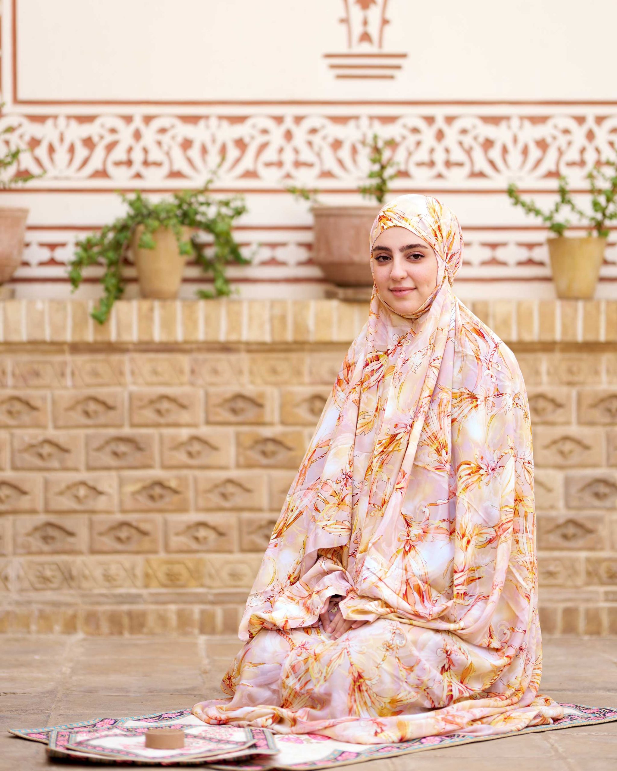 چادر نماز رنگی طرحدار پارچه کُدَری زمینه زرد کرم کد CH 021
