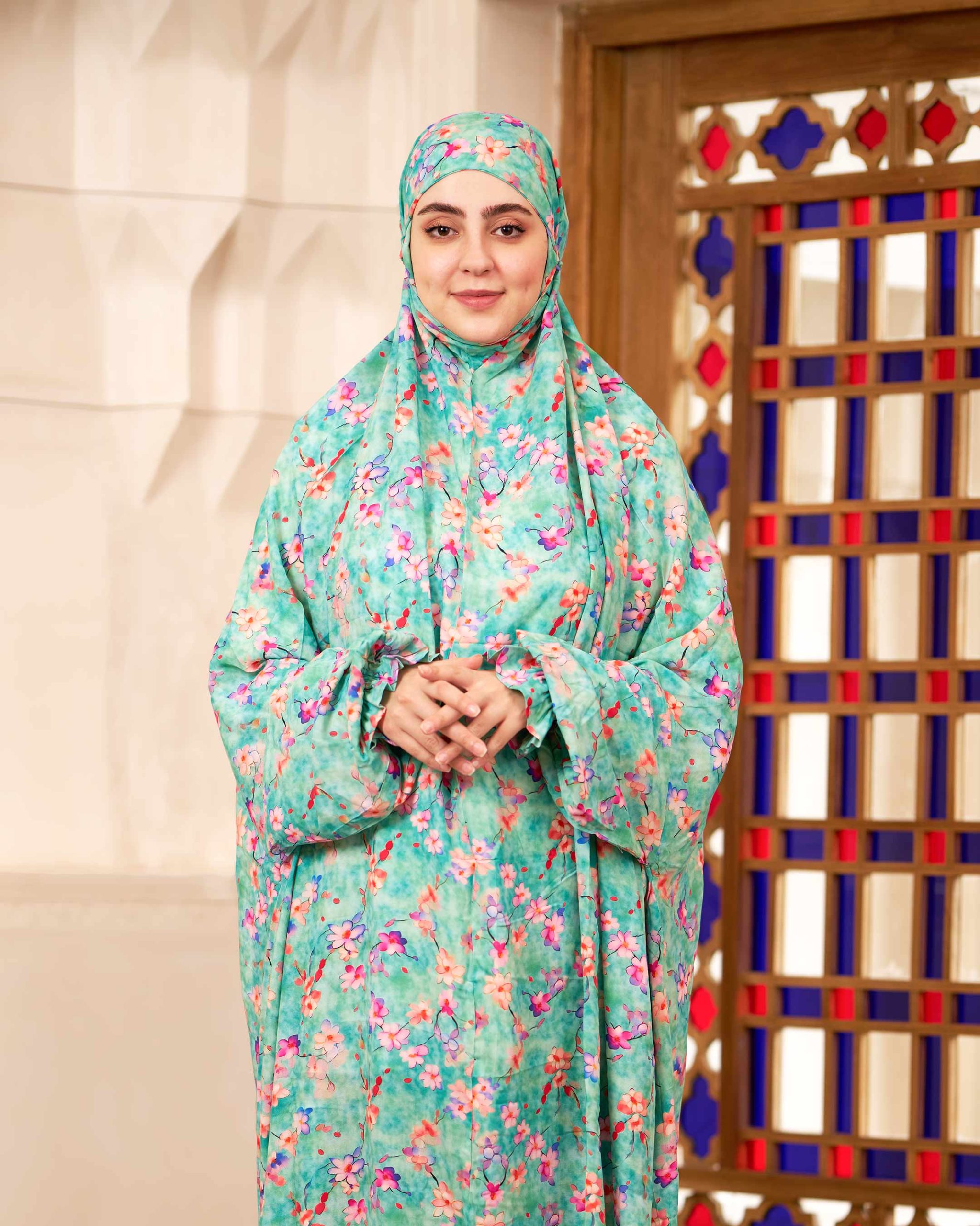 چادر نماز رنگی طرحدار پارچه کُدَری زمینه صورتی سبز کد CH 023